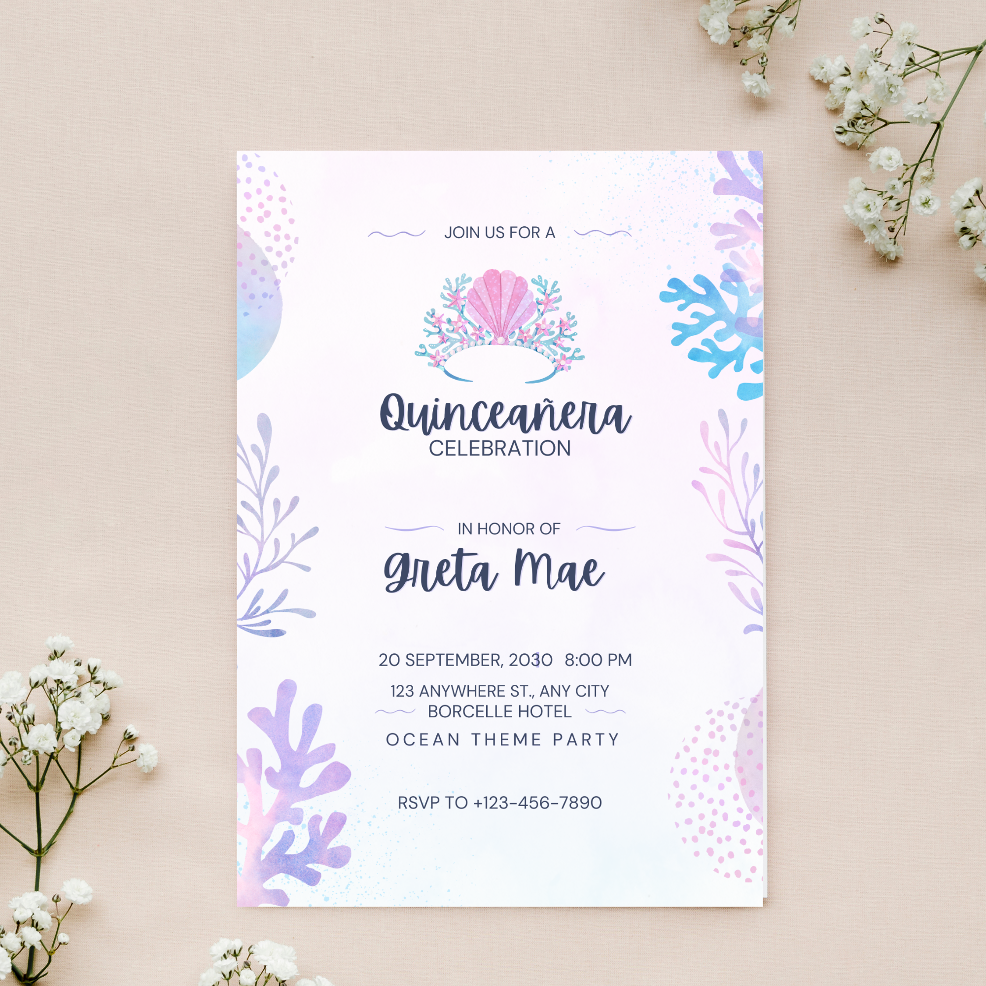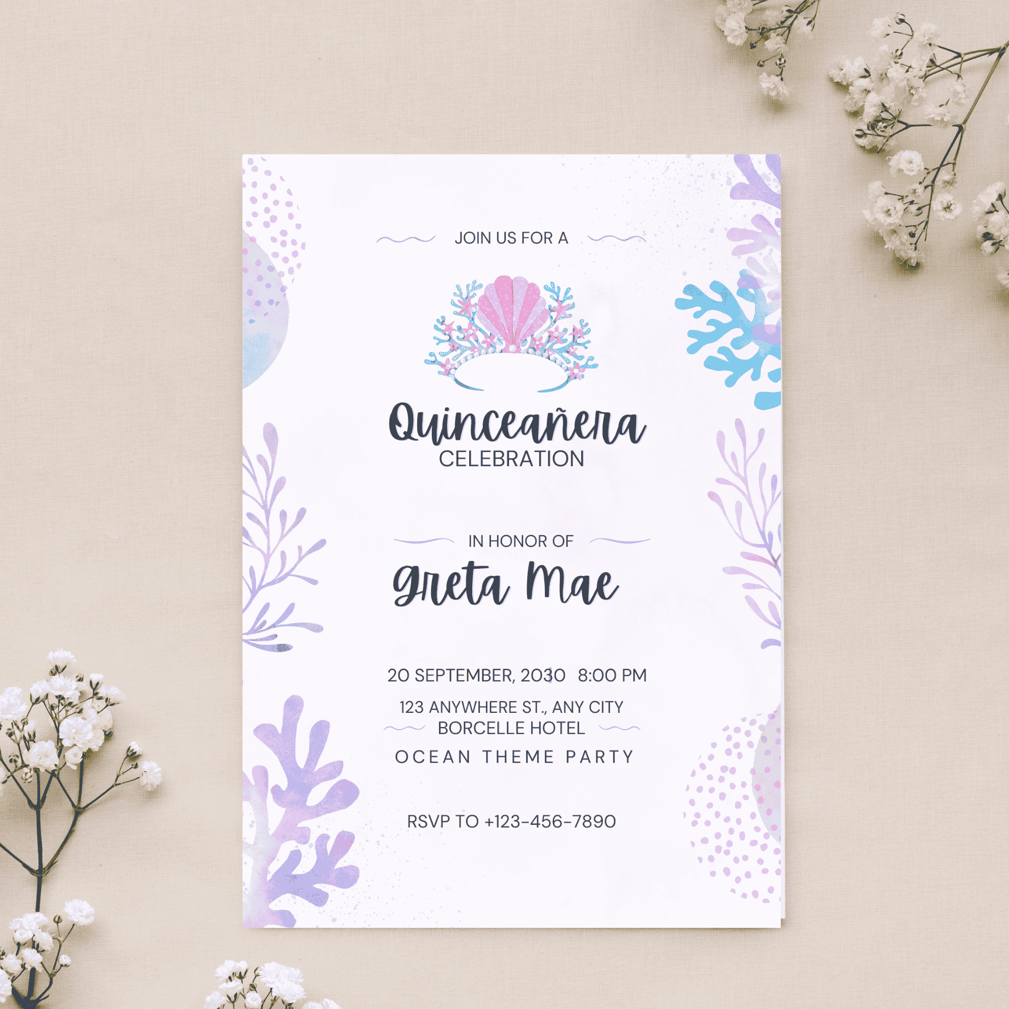 Invitation to a Pink and Purple Oceanic Quinceañera Party