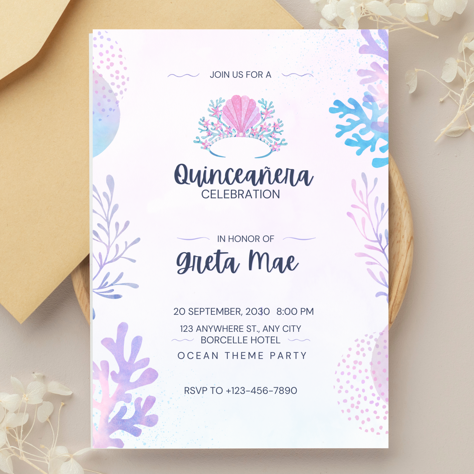 This wonderful Pink and Purple Oceanic Quinceañera Invitation, with its delicate watercolor elements that create an elegant and enchanting ambiance, is a perfect way to celebrate your special day. The combination of pink and purple tones, which are inspired by ocean hues, offers a lively yet elegant touch that is ideal for an unforgettable Quinceañera party.