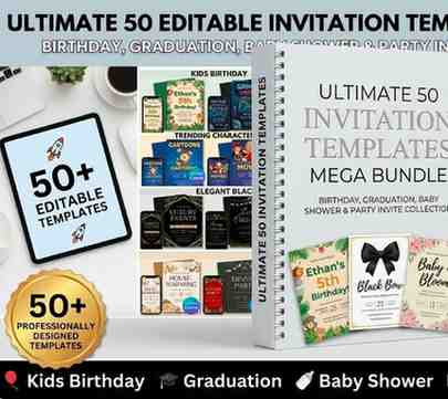 This mega bundle is carefully curated to include 50 fully editable, modern, and best-selling invitation templates covering every major celebration category. From kids’ cartoon-inspired birthdays to elegant milestone events, baby showers to graduation parties, and trendy adult celebrations to seasonal gatherings — this collection gives you unmatched variety in one powerful package.